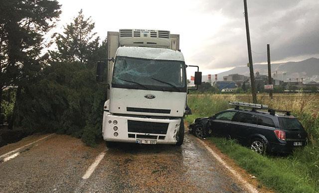 Bursa'da, şiddetli yağış ve fırtınanın etkisiyle yola devrilen ağaca çarpmamak için sürücüsünün manevra yaptığı kamyon, otomobile çarptı. Kazada 2 kişi yaralandı.