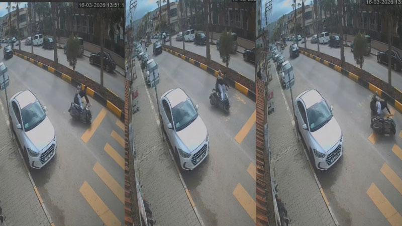 Devrilen motosikletteki 2 kişi yaralandı; kaza kamerada