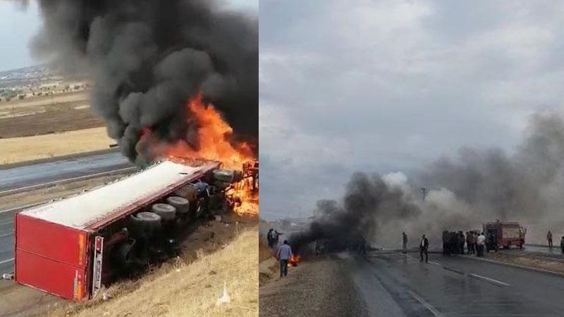 Diyarbakır’ın Kocaköy ilçesinde sürücüsünün kontrolünden çıkarak devrilen TIR'ın kupa kısmı alev alarak yandı. O anlar cep telefonu kamerasıyla kaydedildi.