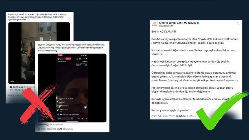 DMM'nin sosyal medya hesabından yapılan paylaşımda, "Bazı sosyal medya hesaplarından paylaşılan, 'Bayburt KYK Kız Öğrenci Yurdu mescidinde, bir öğrencinin bıçaklı saldırıya uğradığı ve olayın örtbas edilmeye çalışıldığı' iddiası doğru değildir. Bayburt'taki kız öğrenci yurdunda, bir öğrenci mescitte bulunduğu sırada kendisini hafif şekilde yaralamıştır. Hastaneye kaldırılan öğrencinin durumunun iyi olduğu bildirilmiştir. Öğrencinin, daha sonra arkadaşını telefonla arayıp durumunu anlattığı ortaya çıkmıştır. Yurtta kalan diğer öğrenciler yaşanan olayı farklı yorumlamış ve eylem düzenlemiştir. Öğrencilere yaşanan olayla ilgili olarak yapılan doğru bilgilendirmelerin ardından öğrenciler dağılmıştır. Asılsız iddialara itibar etmeyiniz" ifadelerine yer verildi.