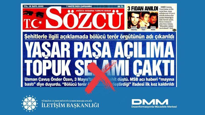 Cumhurbaşkanlığı İletişim Başkanlığı Dezenformasyonla Mücadele Merkezi (DMM), "Bazı basın yayın organlarında yer alan, 'Milli Savunma Bakanlığı'nın (MSB) şehitlerle ilgili açıklamasında bölücü terör örgütünün adı ilk kez çıkarıldı' şeklindeki iddialar doğru değildir" açıklamasında bulundu.