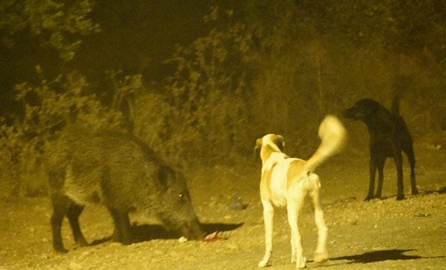 Köpekler ile yaban domuzunun kavgası, Demre ilçe merkezindeki Büyük Kum Mahallesi Kum Dağı Mevkisi'ndeki ana caddede yaşandı. Sitede yaşayanlar, akşam saatlerinde sokak köpekleri için kaldırıma yemek bıraktı. Uzun süredir bölgede tek olarak görülen yaban domuzu, hızla gelerek, yemeği yemeye başladı. 3 sokak köpeği de domuza saldırmak istedi. Köpekler ile kavga eden yaban domuzu, caddeden uzaklaştı. Bölgede oturanlar, domuzların genellikle sürü halinde gezdiğini, geceleri yürüyüşe çıkamadıklarını belirterek, önlem alınmasını istedi.