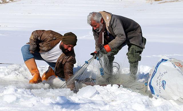 Yaklaşık 25 yıldır baraj gölünde avlandığını söyleyen balıkçı Hikmet Doğal, yazın kayıkla açılıp, kışın buzları kırarak avladıklarını söyledi. Göldeki buzları kazma kürek kullanarak kırdıklarını anlatan Doğal, "Baraj gölüne attığımız ağların uçlarına işaretler koyuyoruz. Bu sayede göl buzlansa da ağımızın yerini kolayca bulabiliyoruz. Buz tutan gölde koyduğumuz işaretlerin bulunduğu noktaları kazma ve kürekle kırıyoruz. Ağın bir ucuna ip bağlayıp diğer ucundan çekiyoruz. Bu sayede balık dolu ağı çekerken, ikinci defa suların altına göndermek için ipi kullanıyoruz. Bazen ağımız dolu geliyor bazen de hiç yakalayamadığımız oluyor. Haftada birkaç kez avlanma imkanımız oluyor" dedi.