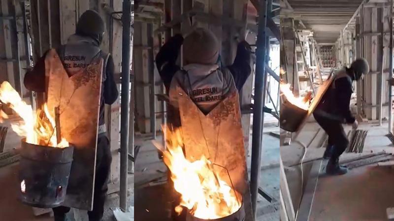 Giresun’un Bulancak ilçesinde kalıp ustası Emre Bulut, inşaatta teneke içinde yaktığı ateşi, sırtına yerleştirdiği koruyucu levha yardımıyla taşıyarak, dondurucu soğuktan korunmaya çalıştı. Bulut’un görüntüleri, sanal medyada ilgi odağı oldu.