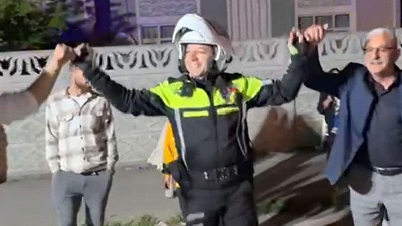 Düğün konvoyundaki araçları yoldan kaldıran polis, davet üzerine halaya katıldı