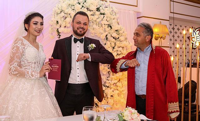 Çiftin nikah töreninde de benzer durum yaşandı. Nikah masasına oturan çiftin nikahını, Antalya Büyükşehir Belediyesi'nin nikah memuru Mustafa Pilavcu kıydı. İmzaların atılmasıyla birlikte evlilik cüzdanını alan damat Yeşil, Pilavcu ile tokalaşmak istedi. Ancak aldıkları önlem nedeniyle tokalaşmayan ikili dirseklerini birbirine vurdu. Yaşanan bu olay davetliler arasında gülüşmelere neden oldu.