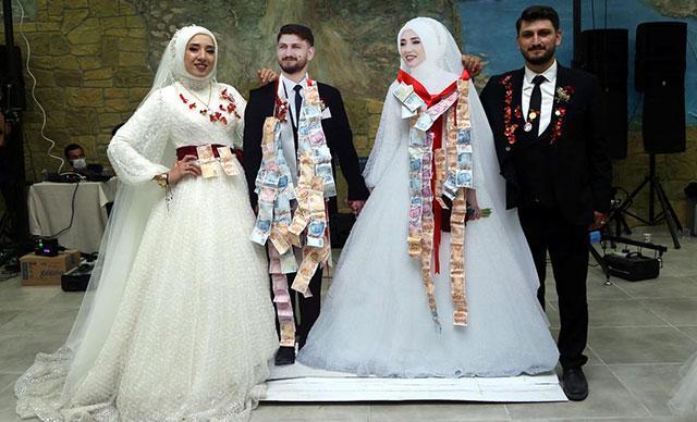 Zonguldak'ın Alaplı ilçesinde, Ömer Salih Gül ile Funda Ersöz çiftinin düğününde takılar, gelin ve damadın fotoğraflarından yapılan karton maketlere takıldı.