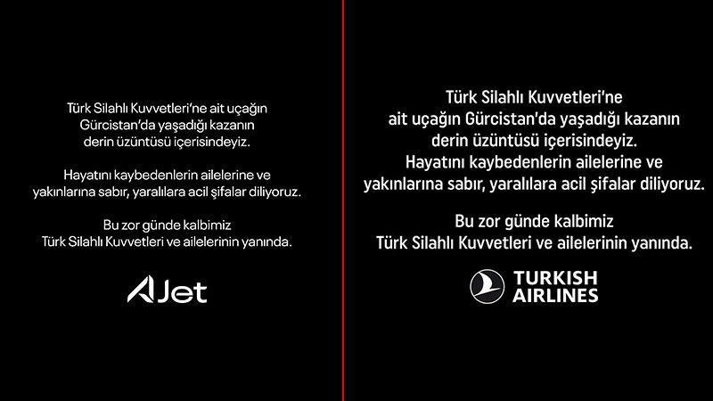 Azerbaycan’dan Türkiye’ye gelmek üzere havalanan kargo uçağının Gürcistan-Azerbaycan sınırında düşmesinin ardından Türk Hava Yolları (THY), Pegasus ve AJet taziye paylaşımında bulundu.