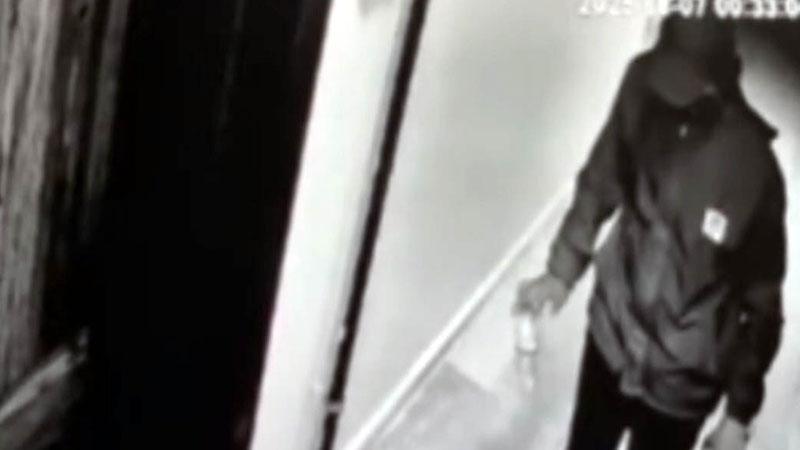 Görüntülerde dairenin önüne gelen şapkalı ve yüzü maskeli bir kişi, önce yanında getirdiği yanıcı maddeyi dairenin önüne döküyor, daha sonra ise döktüğü maddeyi ateşe vererek olay yerinden kaçıyor.