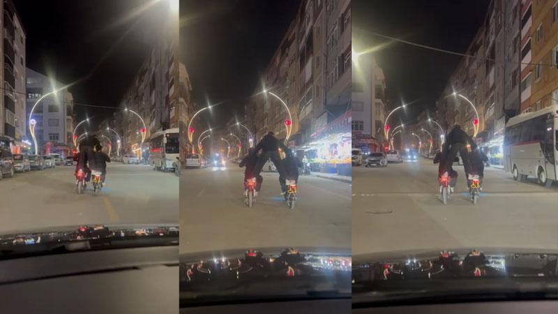 Olay dün akşam saatlerinde Yeşil Mahalle Taşkent Caddesi’nde meydana geldi. İki elektrikli bisiklete ayaklarını uzatan kişi sürücülere tutunup caddede ilerledi. Tehlikeli yolculuk caddeden geçen bir sürücü tarafından görüntülendi.