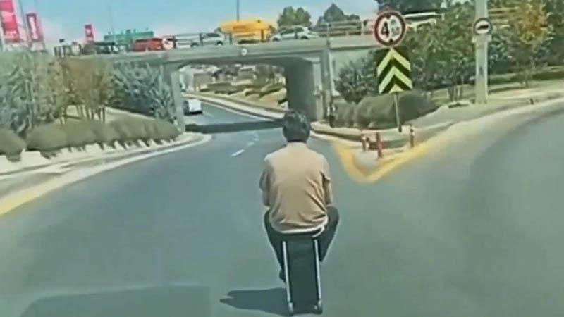 Altındağ ilçesindeki Akköprü kavşağında bir kişi, elektrikli skuter valizle trafikte yolculuk yaptı. Valizle trafikte seyreden kişi, arkasındaki araçtan cep telefonu kamerasıyla kaydedildi. Görüntülerde, valizli kişinin can güvenliğini riske atarak, sağ şeritten ilerlediği anlar yer aldı.