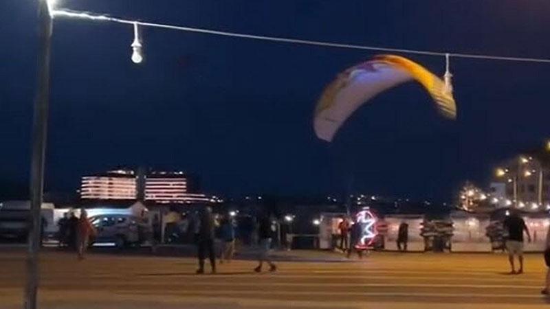İzmir'in Çeşme ilçesinde, paramotorla akrobatik manevralar ile havai fişek gösterisi yapan emekli Astsubay Metin Pehlivan (46), bir tekneye çarptı. O anlar cep telefonu kamerasıyla kaydedilirken, yaralanan Pehlivan hastaneye kaldırıldı.