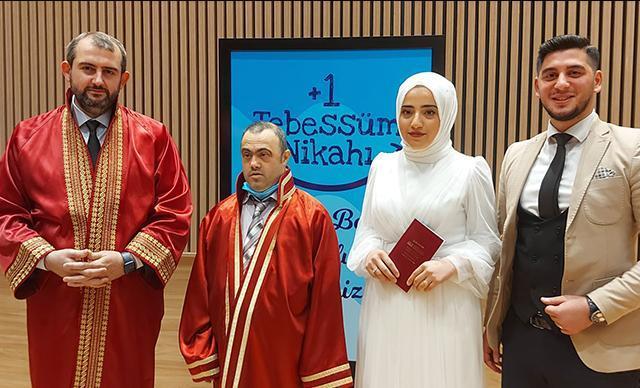 Güngören’de sosyal sorumluk projesi kapsamında başlatılan ‘+1 Tebessüm Nikah’ ile ilk imzayı atan Büşra ile Yunus Emre çiftinin nikahı Down Sendromlu Güngör Aktaş ile Güngören Belediye Başkanı Bünyamin Demir tarafından kıyıldı.