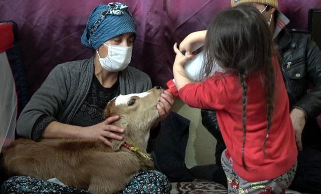 Erken doğan 'yaşamaz' denilen buzağıyı beşiğe yatırıp, biberonla besliyor