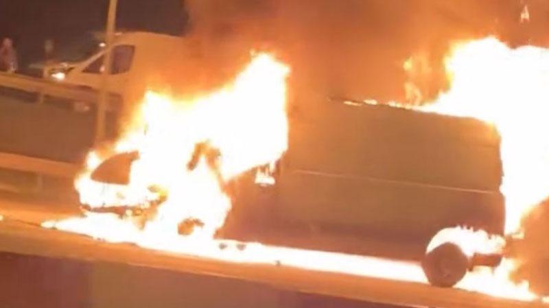 Esenyurt TEM Otoyolu'nda minibüs alev alev yandı