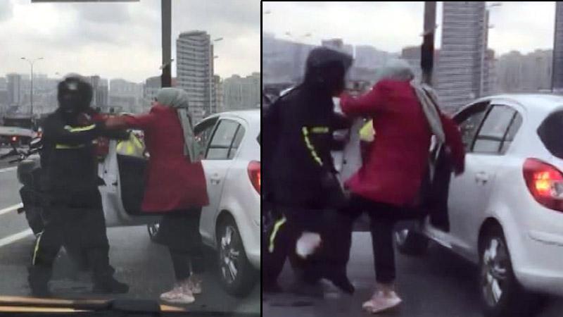 D-100 Yan Yolda Beylikdüzü yönüne ilerleyen bir motosikletli ile otomobil sürücüsü yol verme konusunda anlaşamadı. Kadın sürücü otomobilinin önüne bir anda geçen motosikletliye çarpmamak için aniden durmak zorunda kaldı. Sürücünün durduğunu gören motosikletli de yanına geldi. Otomobil sürücüsü, motosikletliye 'neredeyse kaza yapmasına neden olacağını' söyleyerek tepki gösterdi. Motosiklet sürücüsü hatalı olduğunu belirterek otomobil sürücüsünü sakinleştirmeye çalıştı. Motosikletli, otomobil sürücüsünü aracına bindirmeye çalışırken, kadın tepkisini sürdürerek iki kez tekme atıp kaskına vurdu. Trafikteki diğer sürücülerin 'Yolu kapatıyorsunuz' uyarılarına da bir süre aldırış etmeyen otomobil sürücüsü daha sonra yoluna devam etti. Trafikteki gergin anlar, cep telefonu kamerası ile görüntülendi.