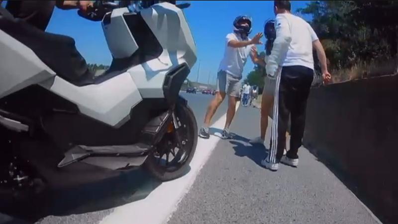 Eyüpsultan TEM Otoyolu'nda tartışan bir çifte müdahale etmek isteyen motosiklet sürücüsü ve eşi, bıçaklı kişinin hedefi oldu. Olay saniye saniye araç kamerasına yansıdı.