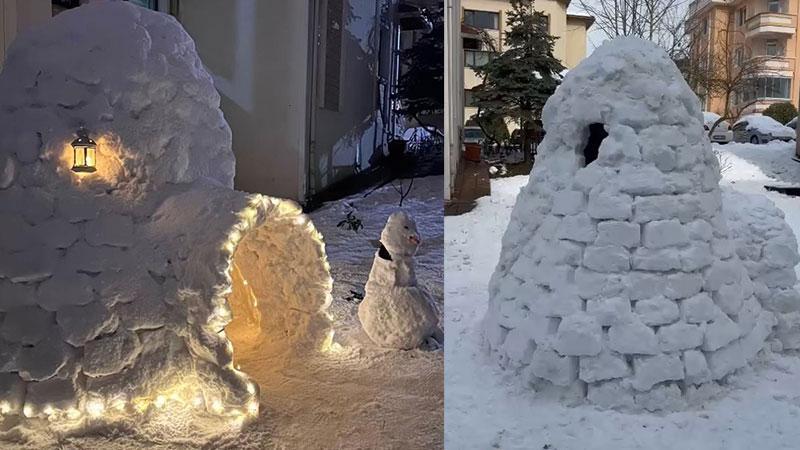 Kapısına kardan adam yaparak çalışmayı tamamlayan grup o anları cep telefonu kamerasıyla kaydederken çocuklar evin içine girerek yemek yedi. Havanın kararmasıyla led ışıklarla süslenen iglo ev, site sakinlerinin ilgisini topladı.