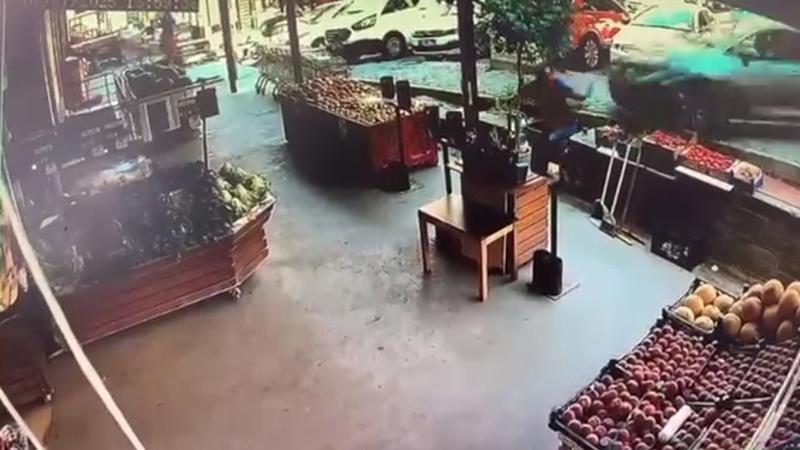 Kaza anında kaldırımda oturan market çalışanı, aracı fark ederek refleksle kendini yere atmaya çalıştı. Ancak çarpmanın etkisiyle hafif şekilde yaralandı. Kazaya karışan otomobille birlikte toplam 3 araçta hasar oluştu. O anlar güvenlik kameralarına saniye saniye yansıdı.