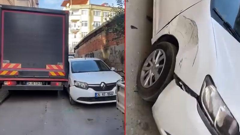 Fatih'te dar sokaktan geçemeyen kamyon, park halindeki araçlara çarparak yoluna devam etti. O anlar başka bir sürücü tarafından cep telefonu kamerasıyla kaydedildi.