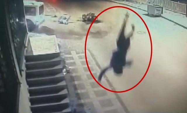 Öte yandan kaza anı güvenlik kameralarına yansıdı. Görüntülerde, üzerinde iki kişinin bulunduğu motosiklet seyir halindeyken karşıdan gelen bir otomobille çarpışıyor. Çarpışmanın etkisiyle motosikleti kullanan kişi yere savrulurken, arka kısmında oturan kişinin metrelerce havaya fırlayarak yere düştüğü görülüyor.