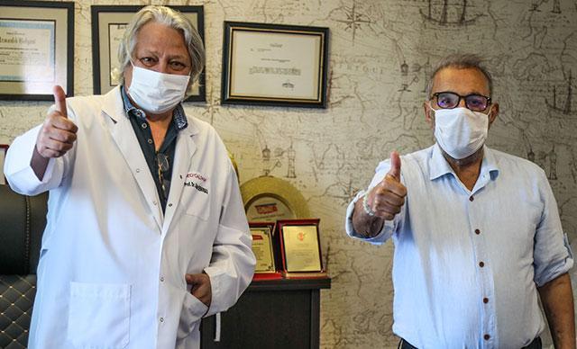 Kontrol için geldiği hastanede Prof. Dr. Alper Demirbaş ile sohbet eden Ferdi Tayfur, teşekkürünü ise esprili şekilde iki elinin parmaklarını şıklatarak gösterdi.