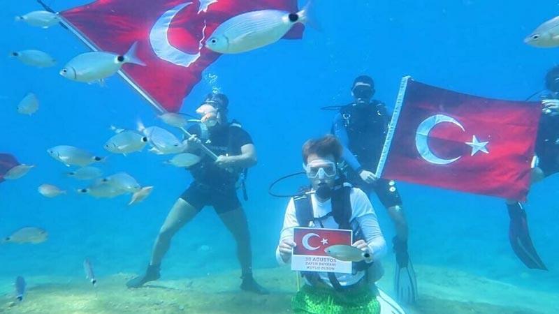 Fethiye Dalış Merkezi dalgıçları Önder Diktaş, Barış Safran, Berkay Çetin, Ersu Mengi, İbrahim Tombak, Burkay Kayıran ve Can Aksoy, sabah saatlerinde Dalyan Koyu açıklarında yaklaşık 8 metre derinliğe dalış yaptı. Bir dalgıç, '30 Ağustos Zafer Bayramı kutlu olsun' yazılı döviz taşırken; diğer dalgıçlar da balıklar arasında Türk bayrağını dalgalandırdı. Su altındaki kutlama renkli görüntülere sahne oldu. Dalış eğitmeni Önder Diktaş, "Zafer Bayramı'mız kutlu olsun. Bu gibi farklı etkinliklerle dalış turizmine katkı sunmaya çalışıyoruz" dedi.