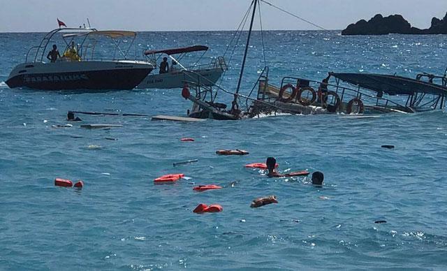 Fethiye'de günübirlik tur düzenlenen tekne, Ölüdeniz mevkisinde, kıyıya 15 metre kala su alarak battı.