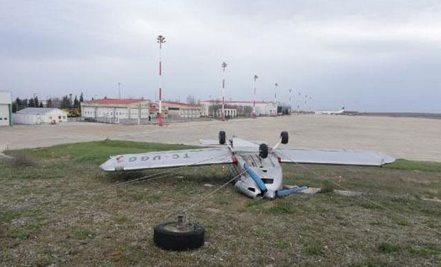 Tekirdağ'ın Çorlu ilçesinde 2 gündür etkili olan şiddetli rüzgar, Çorlu Atatürk Havalimanı’nda park halinde bulunan eğitim uçağını ters döndürdü.