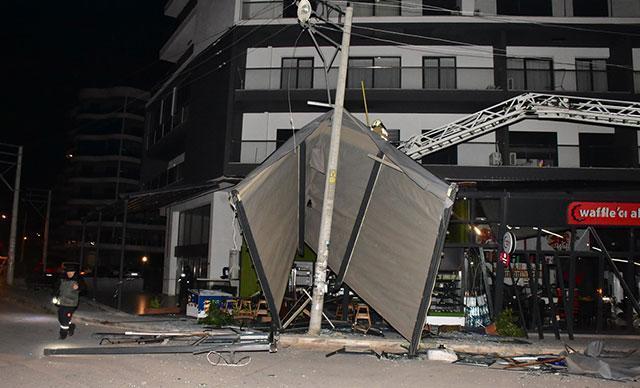 Fırtınada uçan tente elektrik direğine zarar verdi