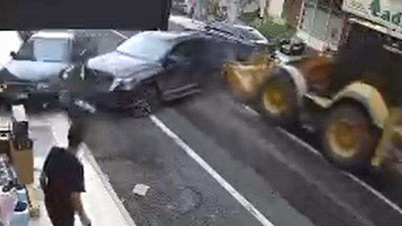 Hatay'ın İskenderun ilçesinde freni boşalan iş makinesi, operatörünün kontrolünden çıkarak caddede bulunan araçlara çarptı. 2 kişinin yaralandığı kaza, güvenlik kamerasına yansıdı.