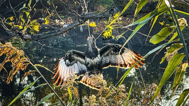 Olay, Karacabey ilçesine bağlı kırsal Harmanlı Mahallesi'nde meydana geldi. Balıkçılık yapan Mesut Der, ormanda ağaca asılı halde şahin fark etti. Gagasına olta takılan ve ağaca asılı kalan şahini kurtarmaya çalışan Mesut Der, başarılı olamayınca doğa fotoğrafçısı Alper Tüydeş'ten yardım istedi. Tüydeş'in ihbarıyla olay yerine gelen itfaiye ekipleri, şahini kurtardı. Herhangi bir yarası olmayan şahin daha sonra doğaya salıverildi.