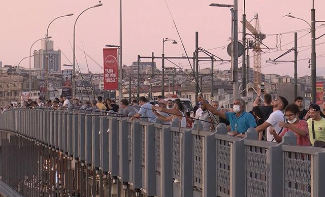 Galata Köprüsü'nde akşam saatlerine doğru balık bereketi yaşandı. Havanın serinlemesiyle birlikte balıkların çoğalması, köprüde balık tutan amatör balıkçıları memnun etti.