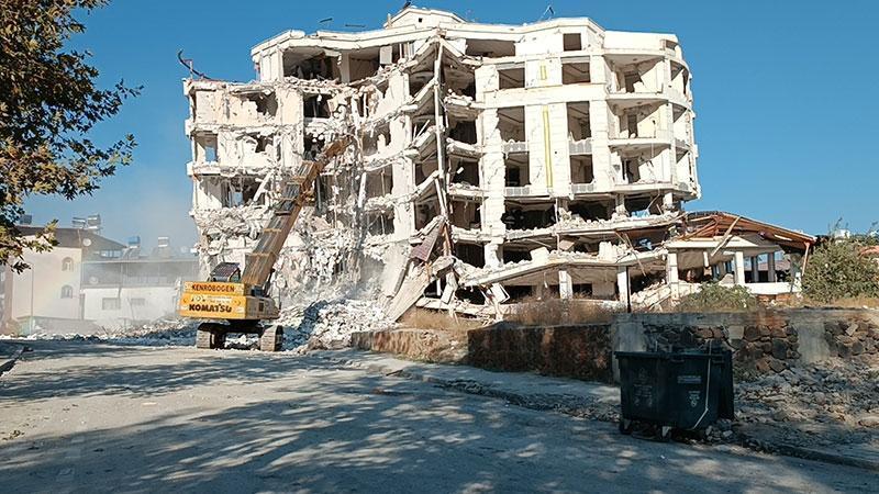 Gaziantep’in İslahiye ilçesinde depremde ağır hasar gören ve 2 kez denenmesine rağmen dinamitle yıkılmayan 6 katlı bina, iş makineleriyle yıkıldı.