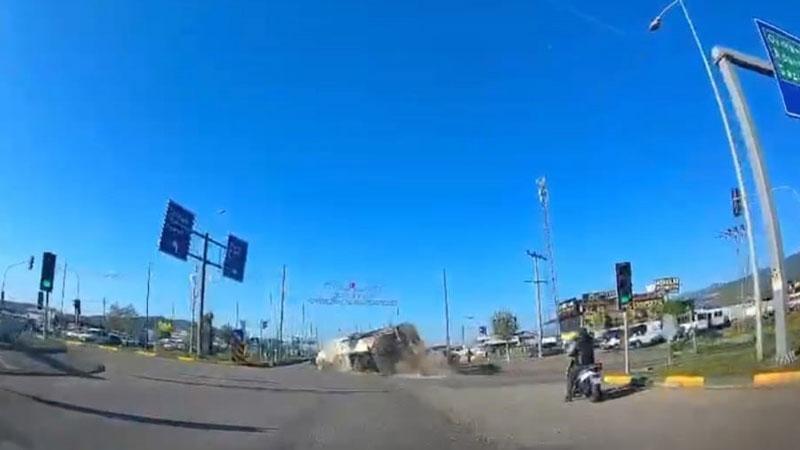 Gaziantep’in Nurdağı ilçesinde devrilen tankerin şoförü D.B. (26) ve yanındaki D.B. (25) yaralandı. Kaza, başka bir aracın kamerasına yansıdı.