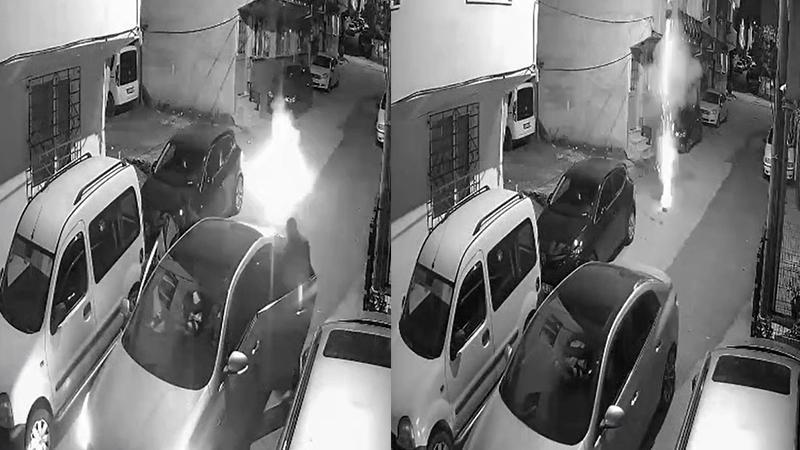 Bursa'da otomobille gelen 4 kişi, ellerindeki havai fişeği sokak ortasında ateşleyip kaçtı. O anlar güvenlik kamerasına yansıdı.