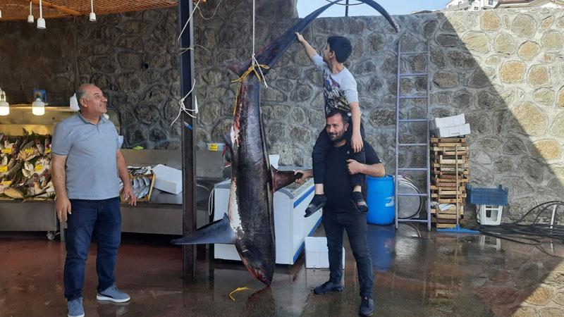 Balığı iş yerinde sergileyen Şahin, "Dün gece palamut avlamak için denize açıldık. Daha sonra ağımıza kocaman bir kütlenin takıldığını hissettik. Baktık ki kocaman bir camgöz var. Yaklaşık 350 kilo civarında 3,5 metre boyunda bir balık yakaladık. Karadeniz Kefken açıklarında yakaladık biz bu balığı dışarı çıkarmak çok zor oldu. Yaklaşık 1 saat boyunca uğraştırdı bizi ama sonunda başardık" dedi.
