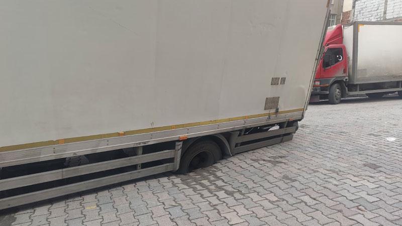 Güngören’de yol çöktü; kamyonunun tekeri çukura saplandı