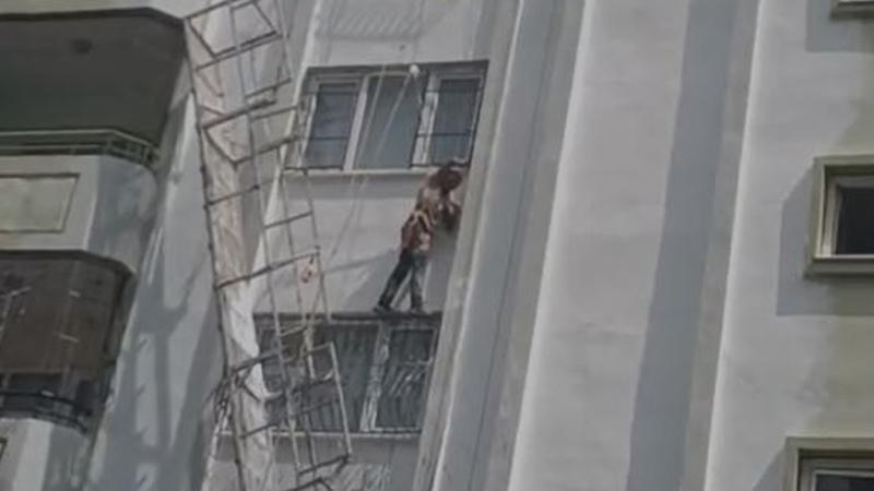 Adana'da dış cephe boyası yapan N.K., bulunduğu iskelenin halatının kopması sonucu metrelerce yüksekte güvenlik kemeri sayesinde asılı kaldı. O anlar, cep telefonu kamerasına yansıdı.