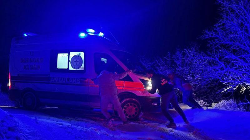 Elazığ'da hasta taşıyan ambulans, kar ve buzlanma nedeniyle yoldan çıktı. Yoldan geçen kamyonet sürücüsünün yardımıyla ambulans bulunduğu yerden çıkarıldı.