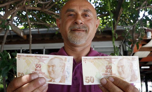 Konyaaltı ilçesinde özel iş yerinde çalışan Mustafa Şahin'in elinde bulunan 50 TL'lik banknot, diğer paralardan farklılığıyla dikkati çekiyor. Paranın ön yüz sağ üst köşesinde '50' yazması gerekirken, basım hatasından dolayı sadece '5' yazıyor. İlk başta sahte olduğu düşünülen para, bankaya götürülerek para sayma makinesinden ve sahte para kaleminden başarıyla geçti. Yapılan incelemede, paranın hatalı basıldığı belirlendi.