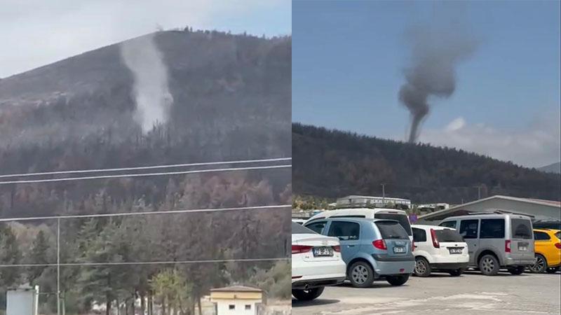 Hatay'ın Antakya ilçesinde, geçen ay yanan ormanda çıkan küçük çaplı hortum, cep telefonuyla görüntülendi.