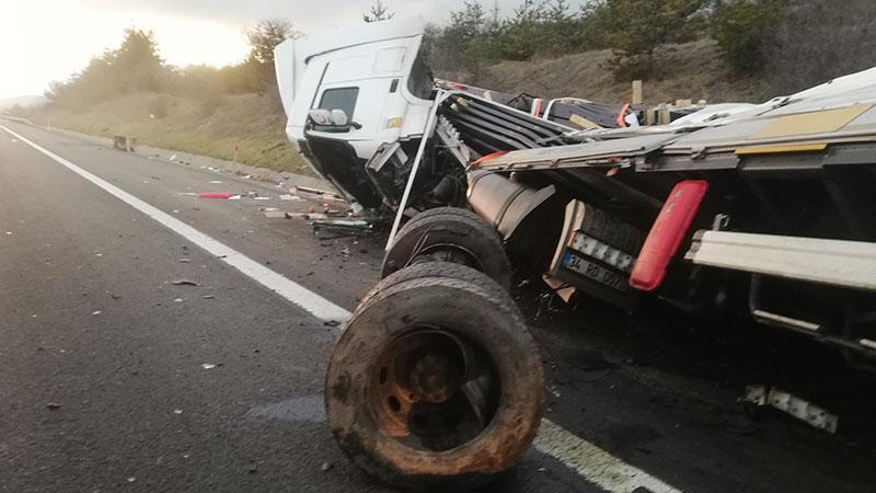 Kaza, saat 18.00 sıralarında Anadolu Otoyolu’nun Yukarı Soku mevkisinde meydana geldi. Gökhan Han yönetimindeki 34 RD 0570 plakalı demir yüklü TIR, sürücüsünün direksiyon kontrolünü yitirmesi sonucu bariyerlere çarptı. Kazada TIR’ın ön ve arka dingilleri koparken çekici kısmı da hurdaya döndü. Kazanın ardından bölgeye polis, sağlık ve itfaiye ekibi sevk edildi. TIR sürücüsü Gökhan Han, kazada parçalanan çekici kısmından yara almadan kurtuldu. Kaza nedeniyle otoyolda trafik yaklaşık 30 dakika kontrollü şekilde sağlandı. Kazayla ilgili inceleme başlatıldı.