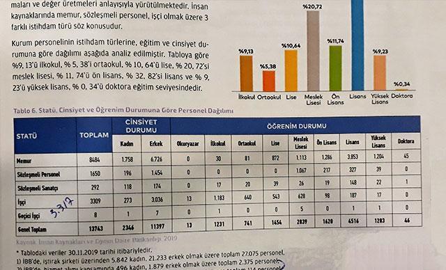 Performans kitabına göre, İBB'nin kendi kadrosunda yer alan 13 bin 743 personelden sadece 2 bin 346’sı kadın. Oran olarak personelin yüzde 83’ü erkek, yüzde 17’si kadın. Yönetici personel içinde ise kadınların oranı yüzde 19’a çıkıyor.
