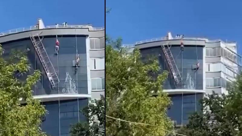 Samsun’un Canik ilçesinde, sitenin dış cephe çalışmasını yapan 2 işçinin üzerinde çalıştıkları asma iskelenin halatı koptu. Dakikalarca havada asılı kalan işçiler kurtarılırken, o anlar cep telefonu kamerasıyla kaydedildi.