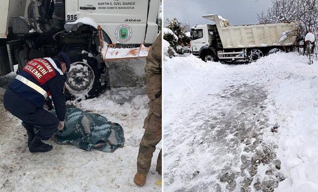 Bartın'da buzlanan yolda kayan aracın kurtarılması çalışmalarını izleyen Tuncay Yaman (45), iş makinesi ile kamyonun arasına sıkışarak hayatını kaybetti.