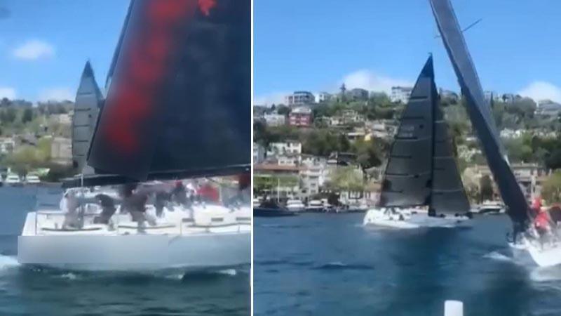 İstanbul Boğazı'nda deprem anları kamerada; yönü değişen yelkenli yan yattı