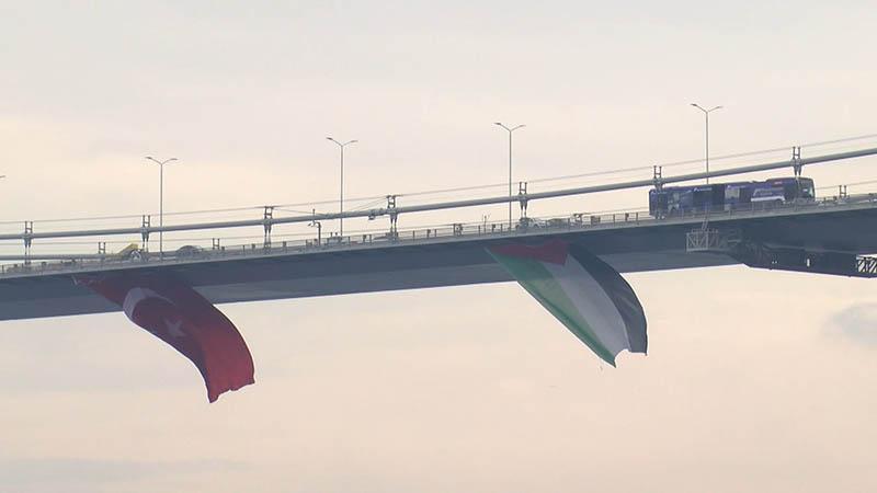 İstanbul Boğazı'ndaki köprülere Filistin'e destek için bayrak asıldı