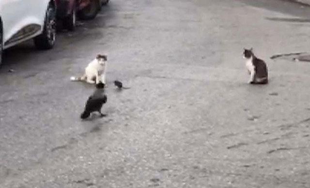 İstanbul'da sokaklarda kedi ve farelerin oyunu... Kargalar seyirci oldu