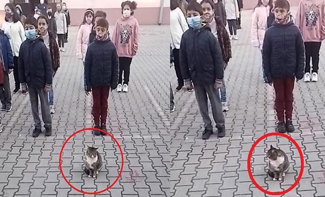 Bursa'da, Dumlupınar Ortaokulu'nun bahçesinde, öğrenciler İstiklal Marşı okuduğu sırada kıpırdamadan duran kedi dikkat çekti. O anlar cep telefonu kamerasıyla görüntülendi.